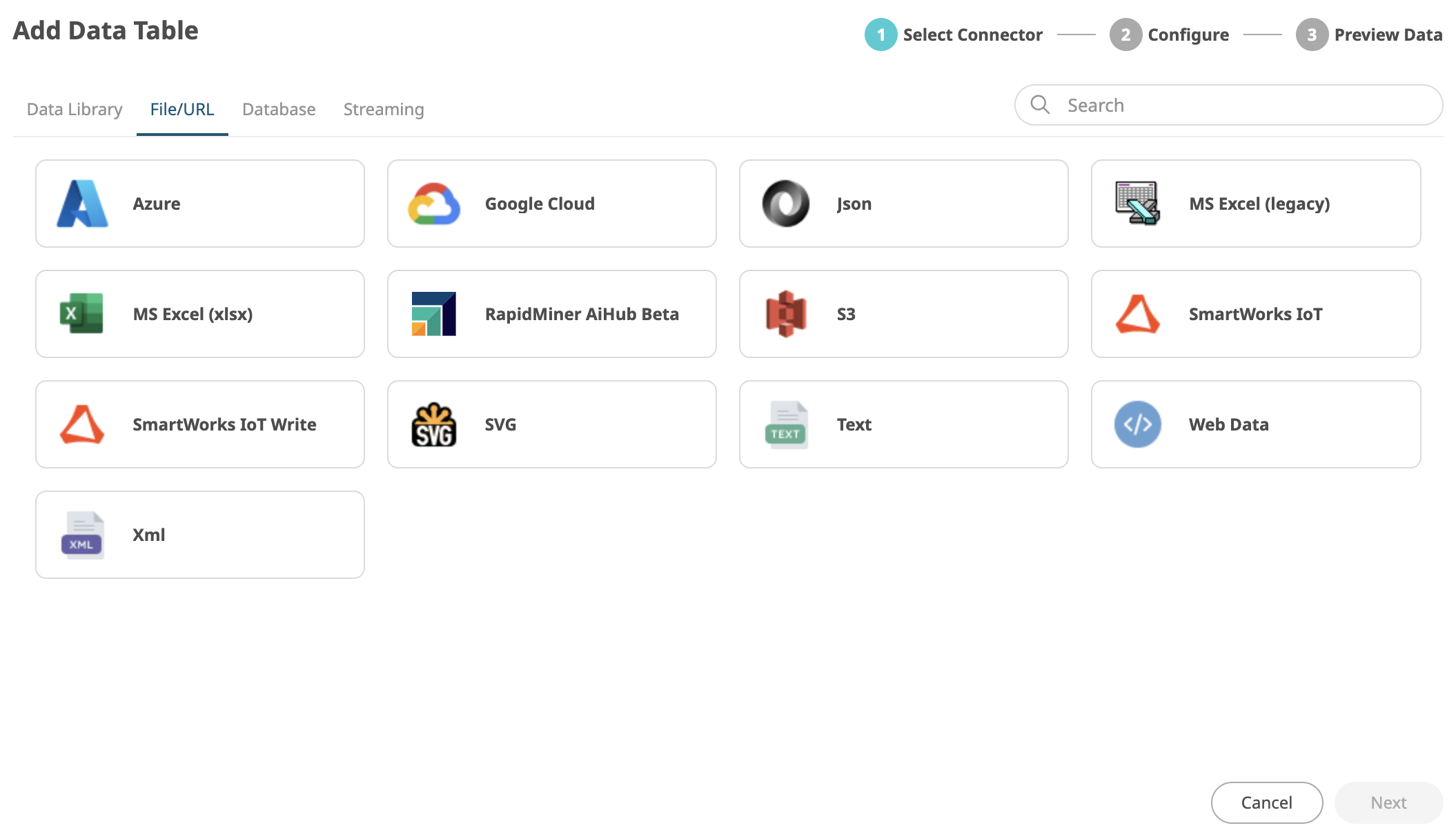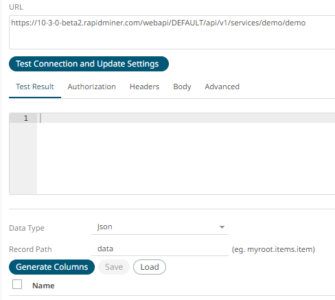 In the File/URL tab, select the RapidMiner data connector, and fill in the following fields: