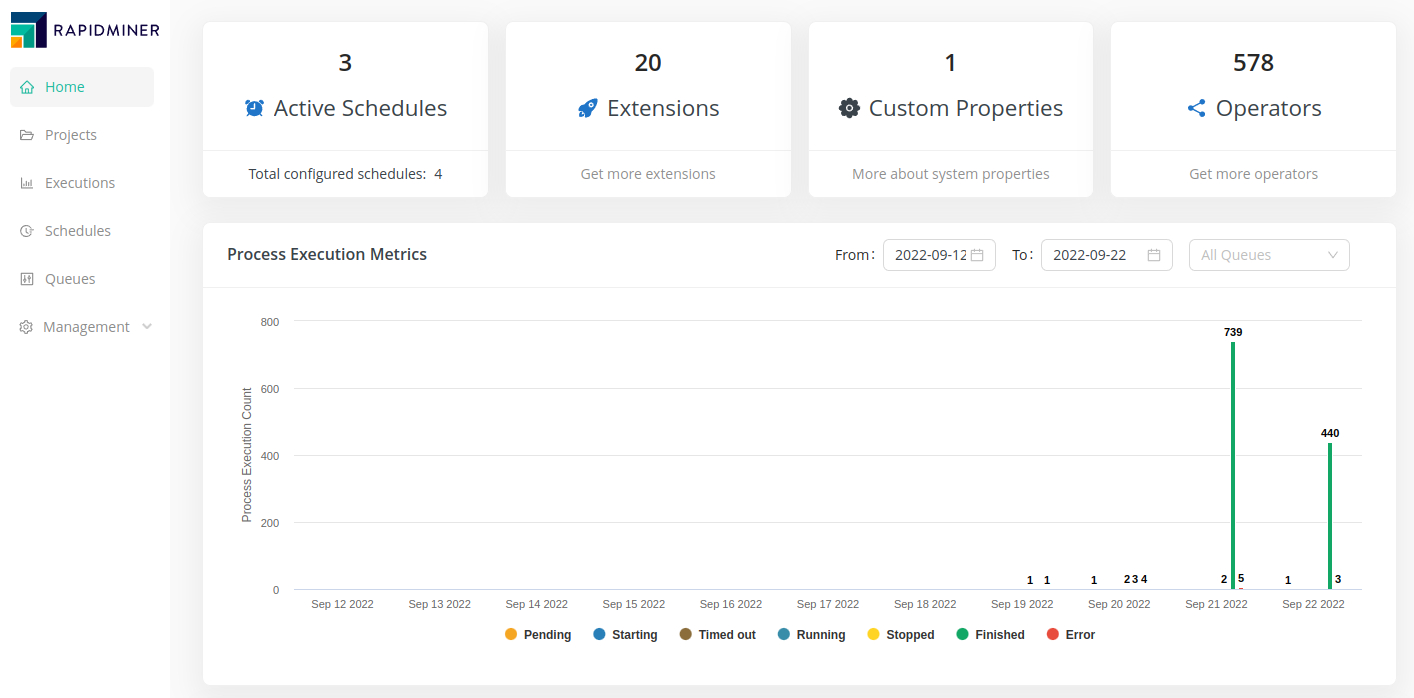 Additionally, an activity summary is available on the Home page of RapidMiner AI Hub: