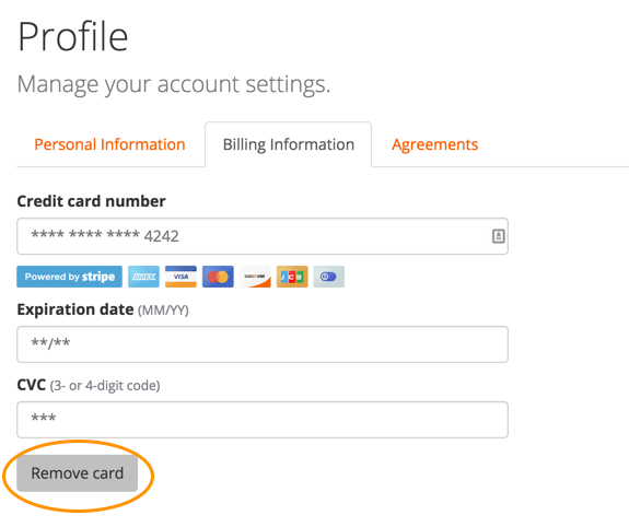 To delete information, click Remove Card to remove the card number, expiration date, and CVC. Other account information remains, which you can modify as required: