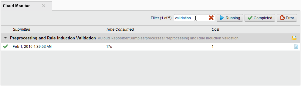 You can open a RapidMiner Cloud process from within the Cloud repository browser, just as you open processes stored in your Local repository. Or, you can open a process that has completed RapidMiner Cloud execution from the Cloud Monitor panel. Note, however, that processes are not versioned. In other words, RapidMiner always opens the latest version of the process, which is not necessarily the version that was executed.