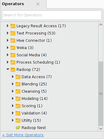 When you install the RapidMiner Radoop extension, several new operators become available in the Radoop operator group of RapidMiner Studio: