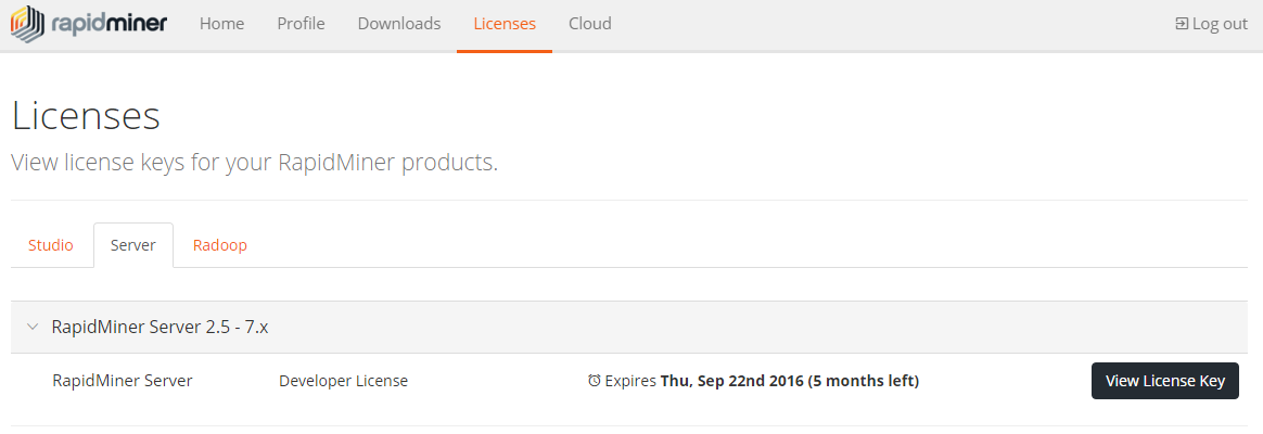 Next. The RapidMiner Server Installer License window opens.From your account portal Licenses page, copy the license key to your clipboard. (See this additional information if you need help copying your key.)