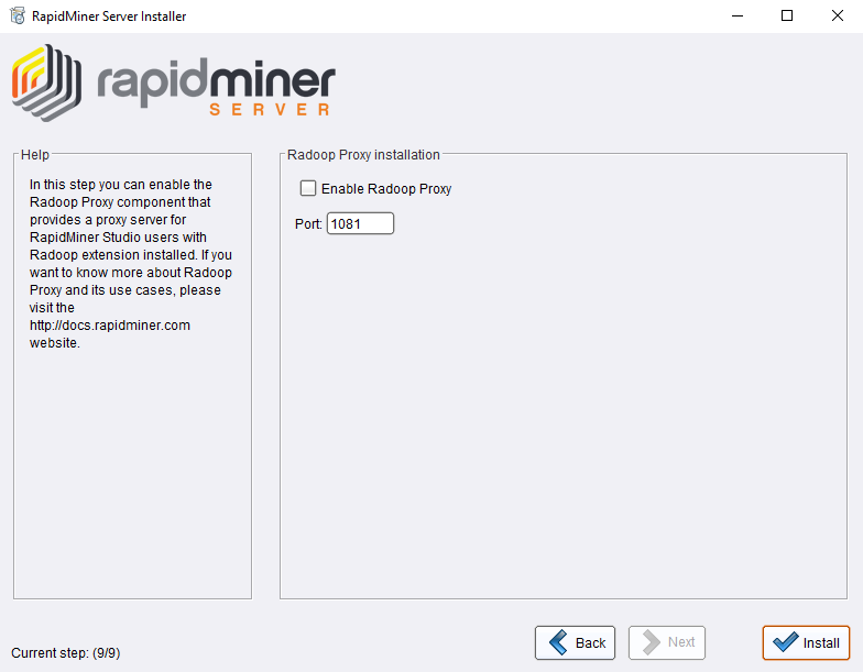 Next.Enter or browse to the location where RapidMiner Server should be installed. Please ensure that the folder path does not contain