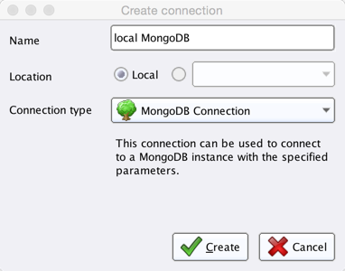 Before you can use the MongoDB connector, you have to configure a new MongoDB connection. For this purpose, you will need the connection details of your database (host name, port, and database name). If your MongoDB installation requires authentication, you will also need valid credentials.