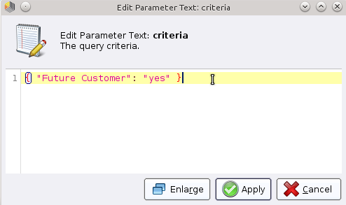 In our example, the JSON documents in our MongoDB collection contain a field named Future Customer. We can specify a simple query criterion that requires the value of this field to be yes (changing the following example to match your own data should be straight forward).