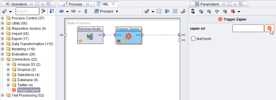 in RapidMiner Studio and drag an example set (e.g., Deals data) into the Process view. Note that the Trigger Zapier operator always needs an operator that provides a data set. Your Zap will be triggered once for each example in this set.Drag the Trigger Zapier operator into the Process view and click on the operator.