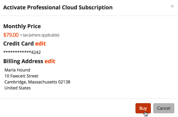 Click Upgrade to this plan. Assuming you have added a credit card, the purchase screen displays: