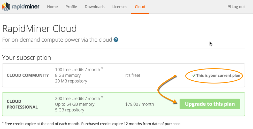 menu within RapidMiner Studio, select Purchase Credits. The RapidMiner Cloud account page opens.Directly from your RapidMiner Cloud account page.
