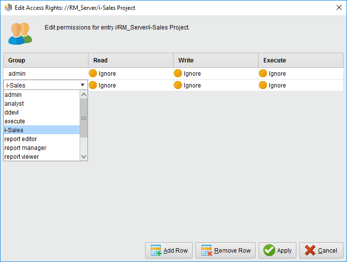 Click Add Row. Click on the Group name and the resulting pull-down arrow to display all groups (which includes the single-entry <username> group) and select the desired group.