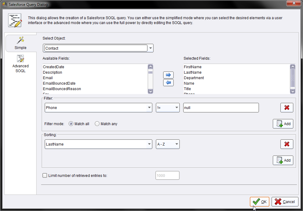 Simple mode (tab at the left of the window) provides you with an interface to build your query; Advanced mode allows you to write your own query.