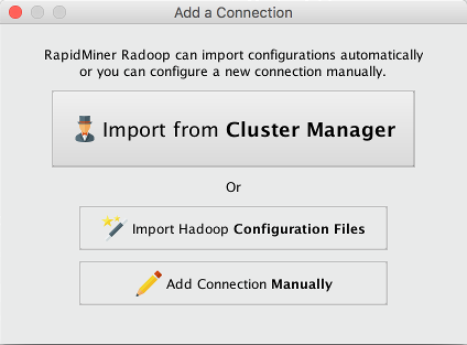 There are three methods to create a Radoop connection. We strongly recommend the first.