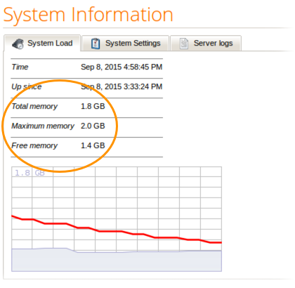 You can view the maximum memory setting for RapidMiner Server in the Administration > System Information window of the web interface. Total memory (amount currently assigned to RapidMiner Server by the operating system), maximum memory (maximum memory amount defined during installation), and free memory (allowed memory not currently in use) are displayed under the System Load tab.