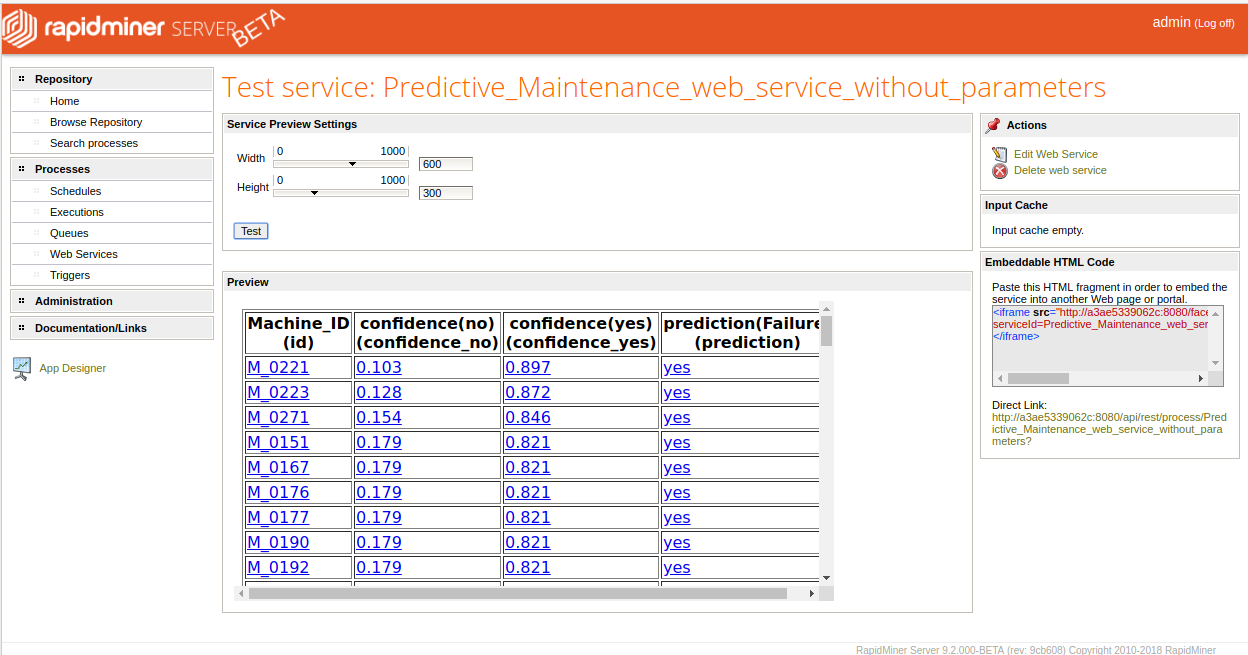 - Predictive_Maintenance_web_service_with_parameters, to predict the probability of failure for a particular value of "Machine ID". This process contains a macro, and when the web service is created, the URL will include a query parameter corresponding to a particular value of "Machine ID".