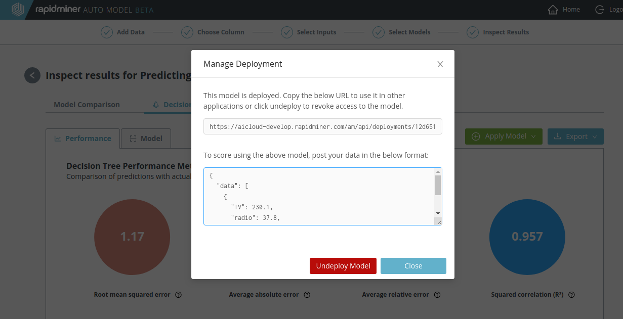 To do so, choose a model, click on Apply Model, and select Deploy Model from the drop-down menu. When the Manage Deployment dialog appears, click Deploy Model.