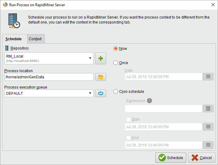 To run a process on a specified date and time, or regularly at a specified time, use the scheduling feature. This feature is only available to processes that are stored on RapidMiner Server.