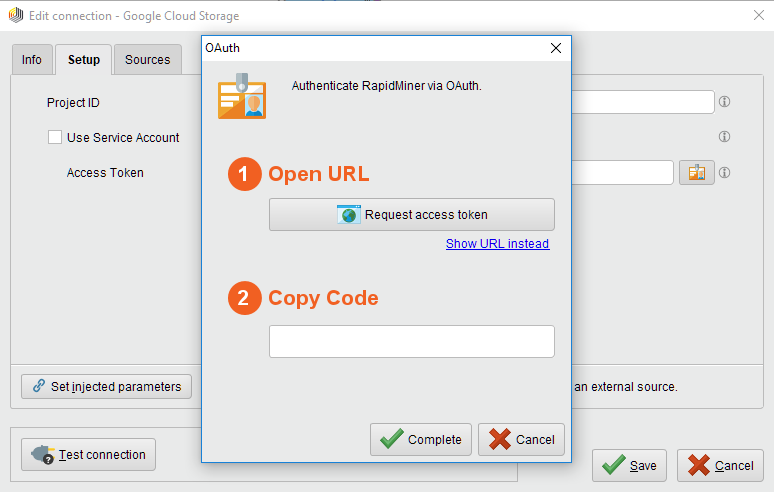 Before you can use the Google Cloud Storage connector, you have to configure a new Google Cloud Services Connection. For this purpose, you will need the connection details of your account. This includes a project ID and either an access token, or a private key for a service account.