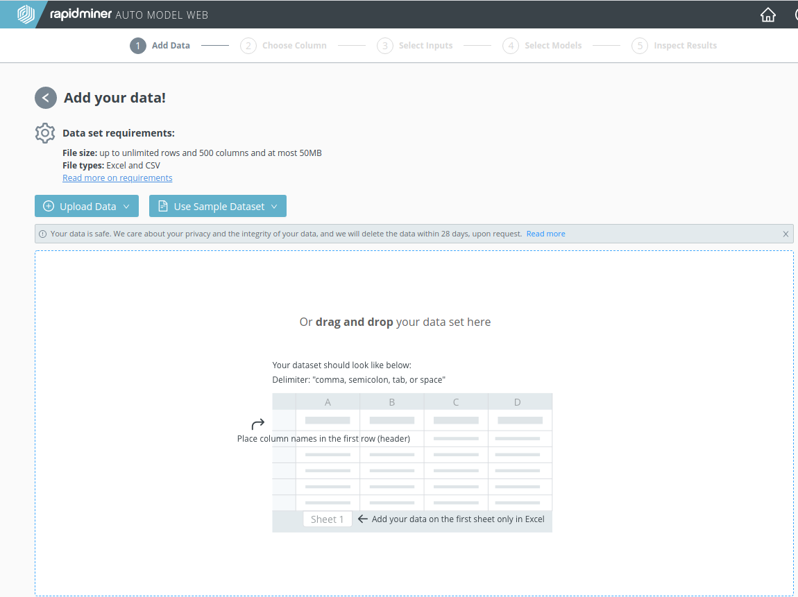 RapidMiner Go accepts data in a spreadsheet format, either Excel or CSV, with the following characteristics: