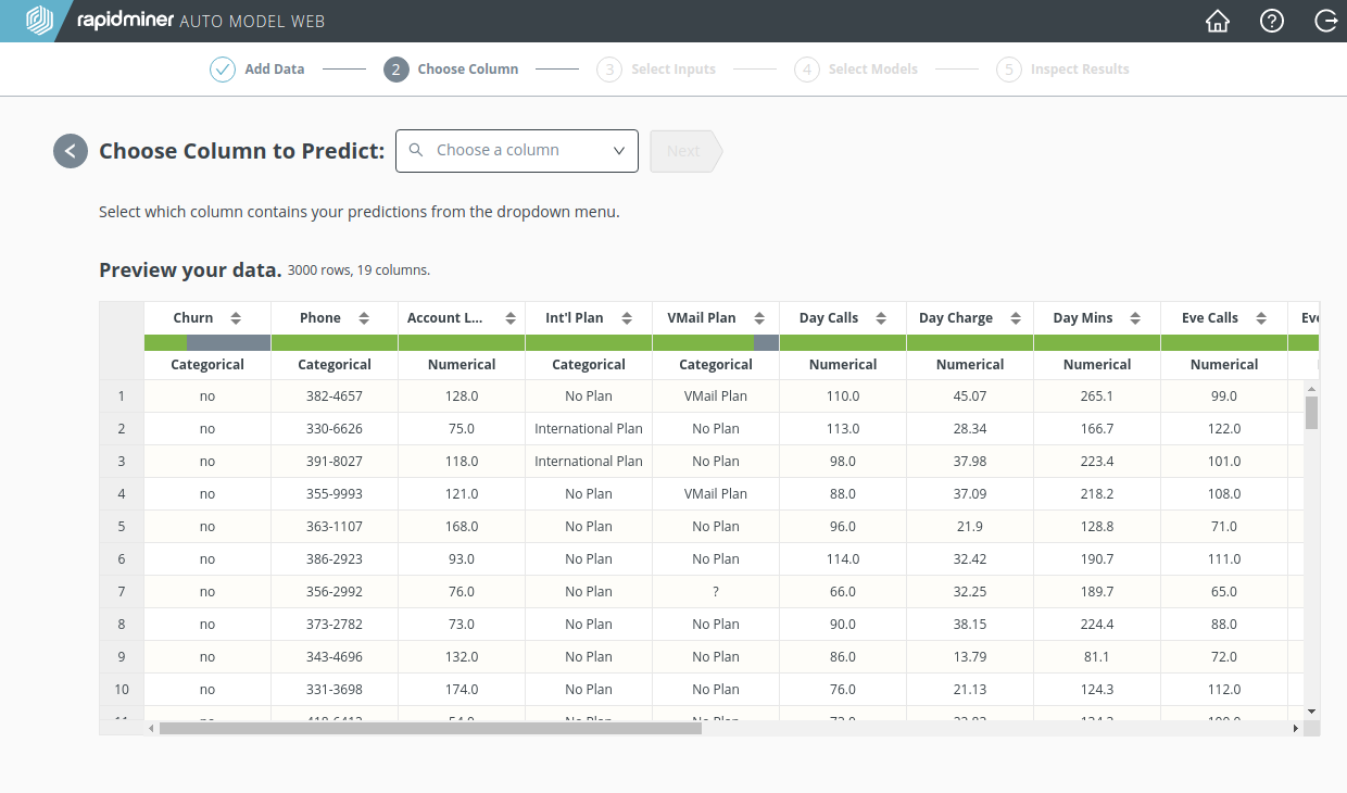 One of the data columns -- we'll call it the target column -- has values that you want to predict. In our current example, the target column is "Churn", since we want to predict who will churn. From the dropdown menu, choose "Churn" before clicking Next.