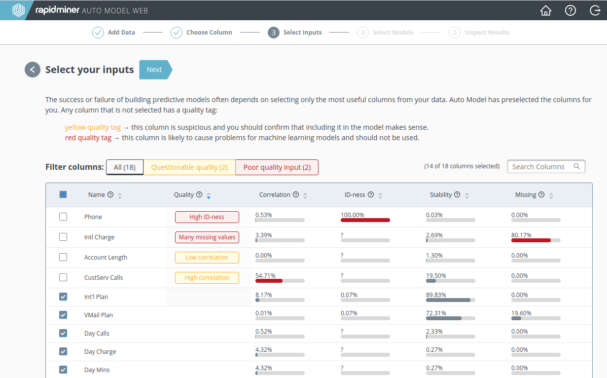 By default, RapidMiner Go will deselect the columns marked with a red or yellow quality tag, but you are of course free to to select or deselect any columns you like! Usually the defaults will work well, but you should pay careful attention if a column is marked with a yellow tag and has high correlation.