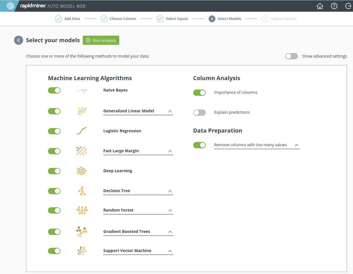 RapidMiner Go provides some of the more popular machine learning algorithms. Depending on the type of data in your target column, only a subset of these algorithms may be available.