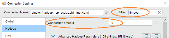 <radoop-entries key="KLS4GvvZta0NhtXfwkXQeSqD11ngXeWP"> <radoop-connection-entry> ... <name>your-connection</name> ... <hive_command_timeout_seconds>30</hive_command_timeout_seconds> <connection_timeout_seconds>30</connection_timeout_seconds> ... </radoop-connection-entry> </radoop-entries>Save the file, then restart RapidMiner Server for the settings to take effect, and for the Sync service to distribute the updated file to all Job Agents in your deployment.