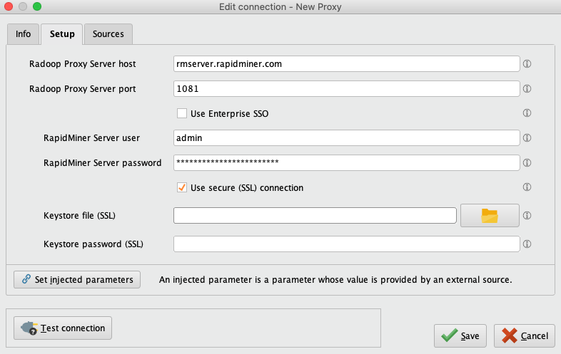 Provide the location of Radoop Proxy server and RapidMiner Server credentials. Check Use SSL, and fill in the required fields: