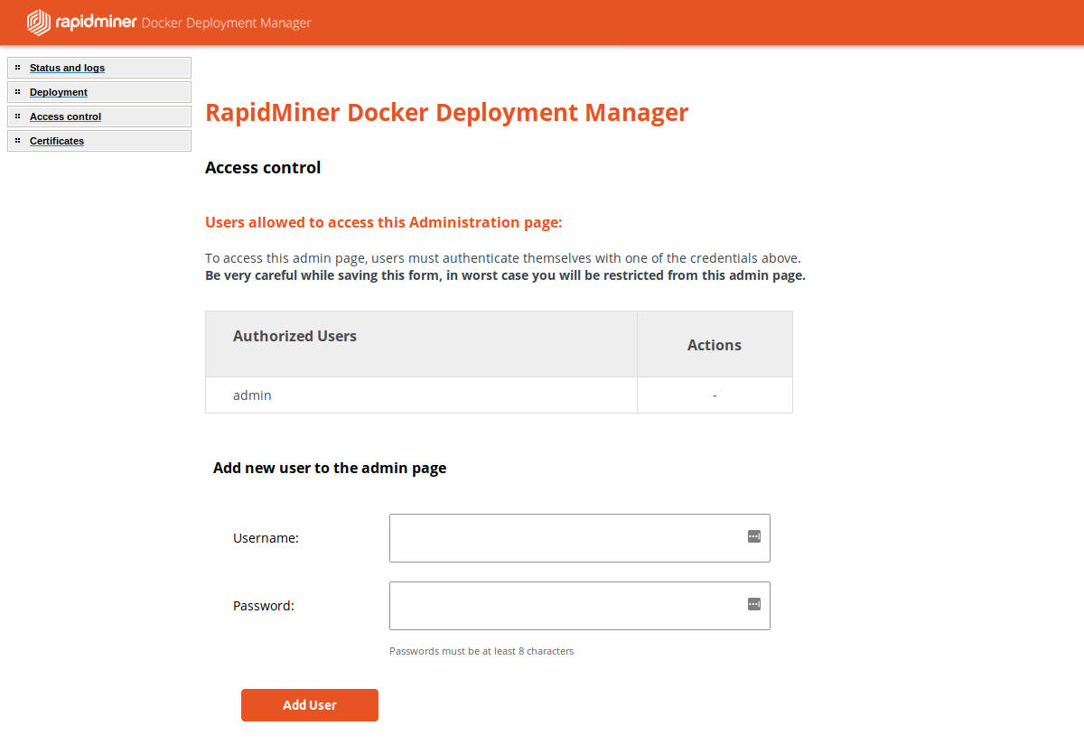 To help our users to manage the RapidMiner Server docker stack built into our cloud images, we provide a WebUI, with the following menu items: