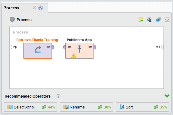 Let's start with a table. To do so we need to publish the data in a process first. Please create the process first and safe it. The name could be Publish Table Data. The process should retrieve the Titanic Training Data and connect this into a Publish to App Operator. Be sure that you use relative paths in the Retrieve operator. Absolute paths can not be used on RapidMiner Server.