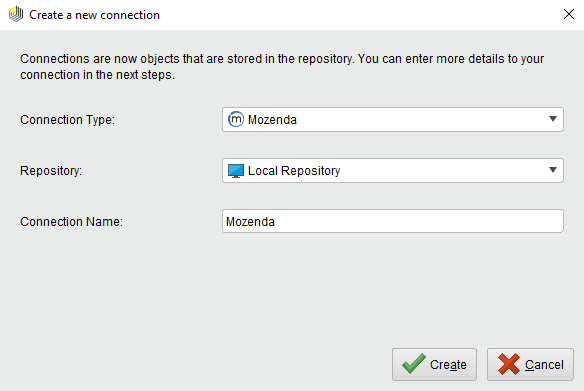 Create Connection and select the Repository from the dropdown of the following dialog.Enter a name for the new connection and set Connection Type to