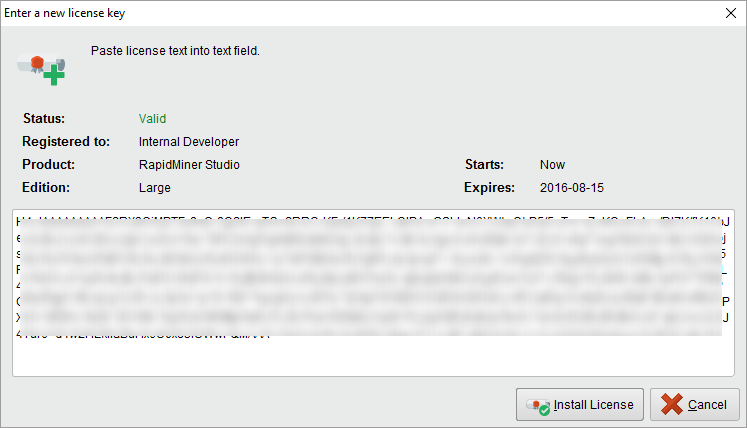 RapidMiner Studio can automatically retrieve the latest license associated with your account if you are logged in to RapidMiner Studio and have an internet connection. If RapidMiner Studio does not have an internet connection (blocked by a firewall, for example), you can also install a license manually.
