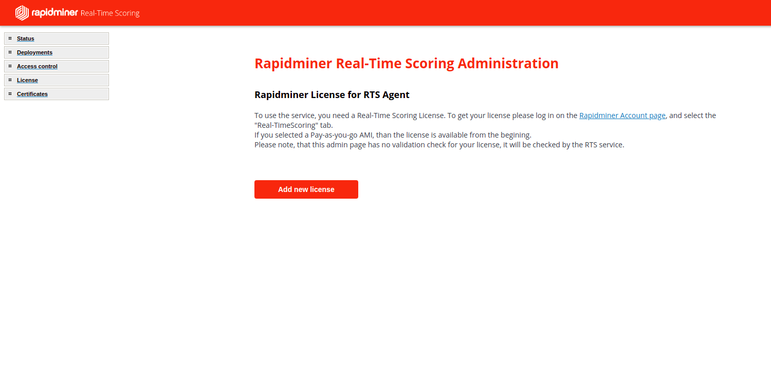 By default the RapidMiner Real-Time Scoring Web UI is accessible on the URL: http://public.ip/rts-admin/, where "public.ip" is the public IP address, or domain name of your Real-Time Scoring deployment.